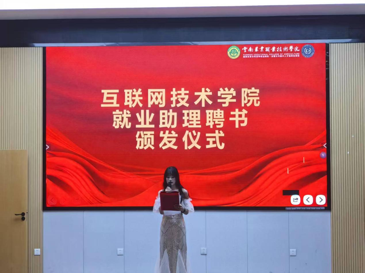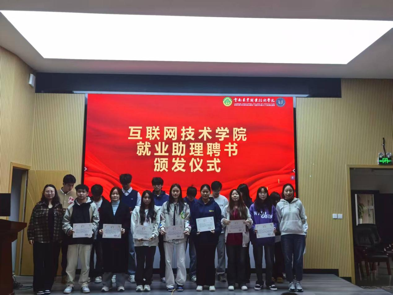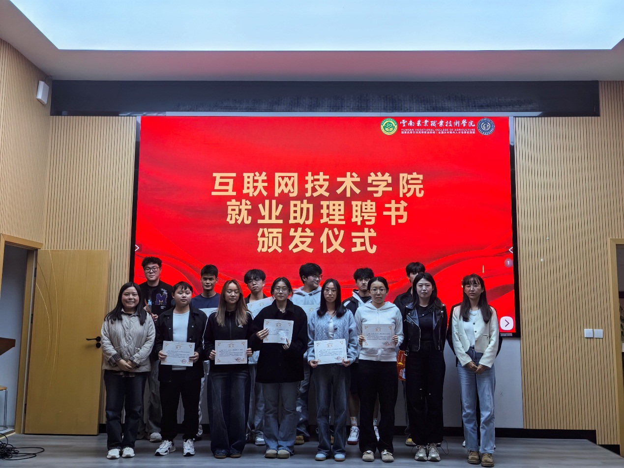教育教学为夯实就业服务根基,助力学生职业成长,2025年10月22日,云南农业职业技术学院互联网技术学院就业助理聘书颁发仪式在学院隆重开展。互联网技术学院直属党支部书记胡琼老师、学工主任陈娜老师、团总支书记李晟老师,以及各班班主任等嘉宾莅临现场,与全体就业助理共同参与这一重要活动。