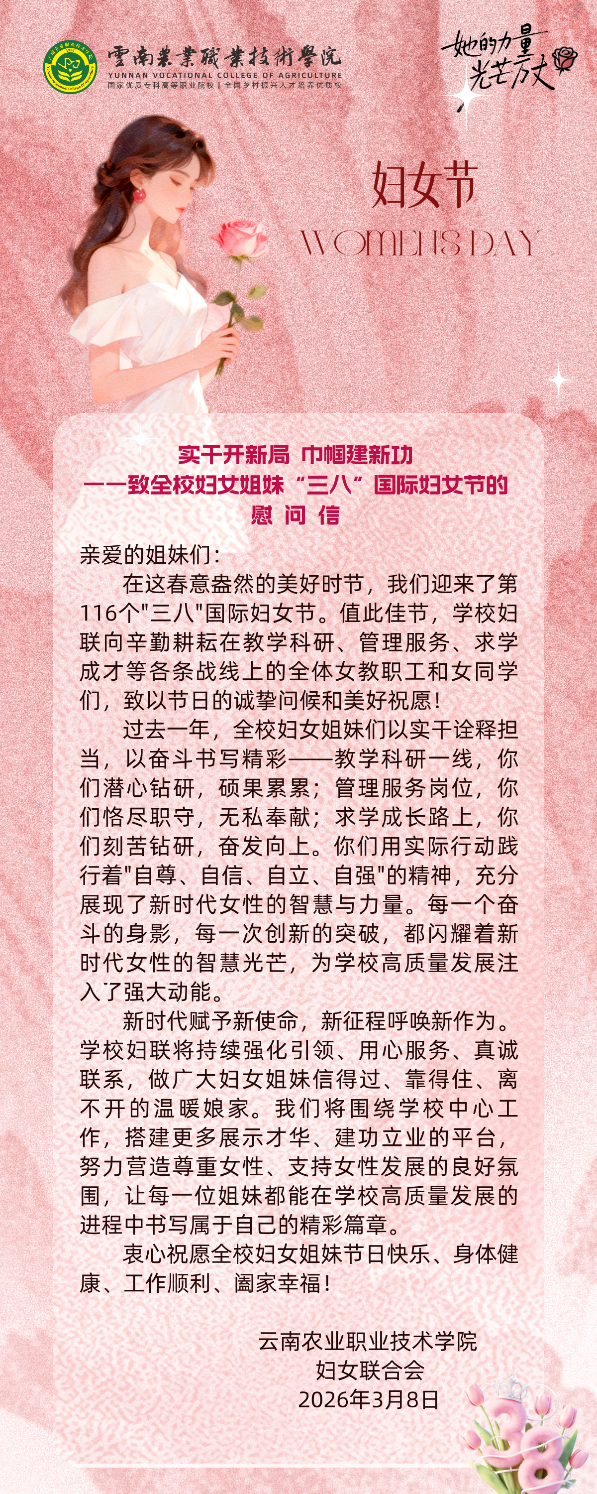 实干开新局,巾帼建新功——致全校妇女姐妹“三八”国际妇女节的慰问信