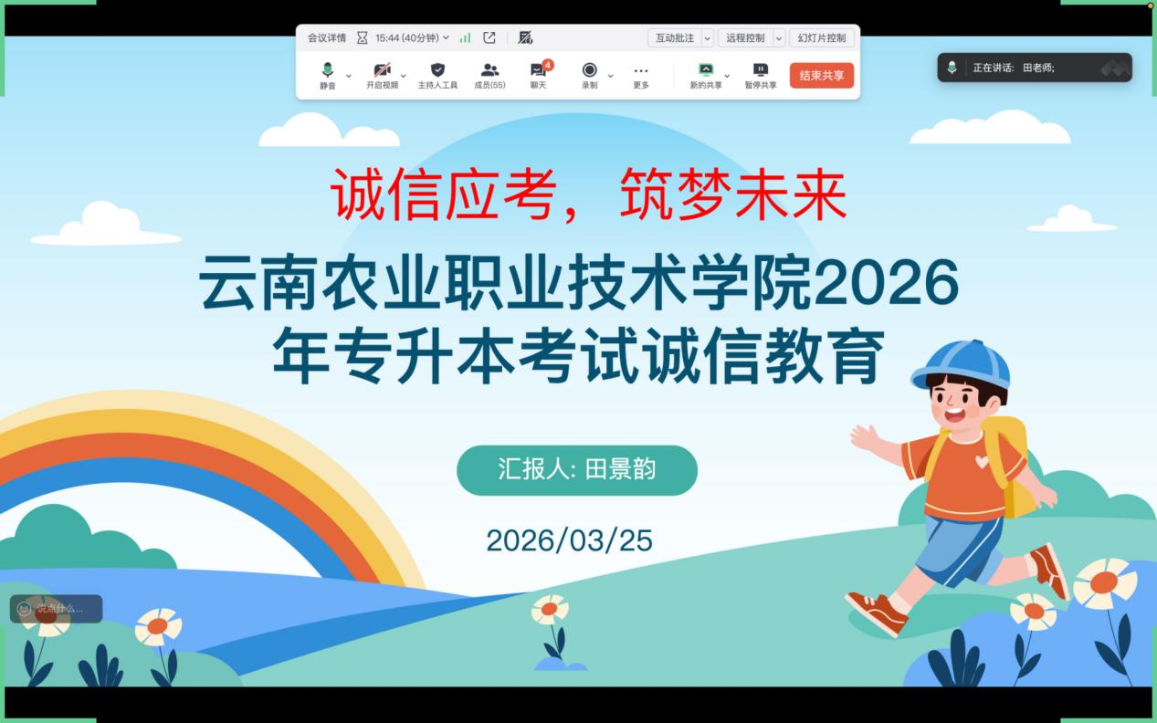 首页频道为强化专升本考生诚信应考意识,规范考试行为,营造公平公正的升学考试环境,切实做好考前教育引导工作,2026年3月25日,互联网技术学院顺利完成16个班级专升本考生“诚信应考,筑梦未来”云南农业职业技术学院2026年专升本考试诚信教育线上班会,全体专升本考生全员参与,为即将到来的专升本考试筑牢思想防线。