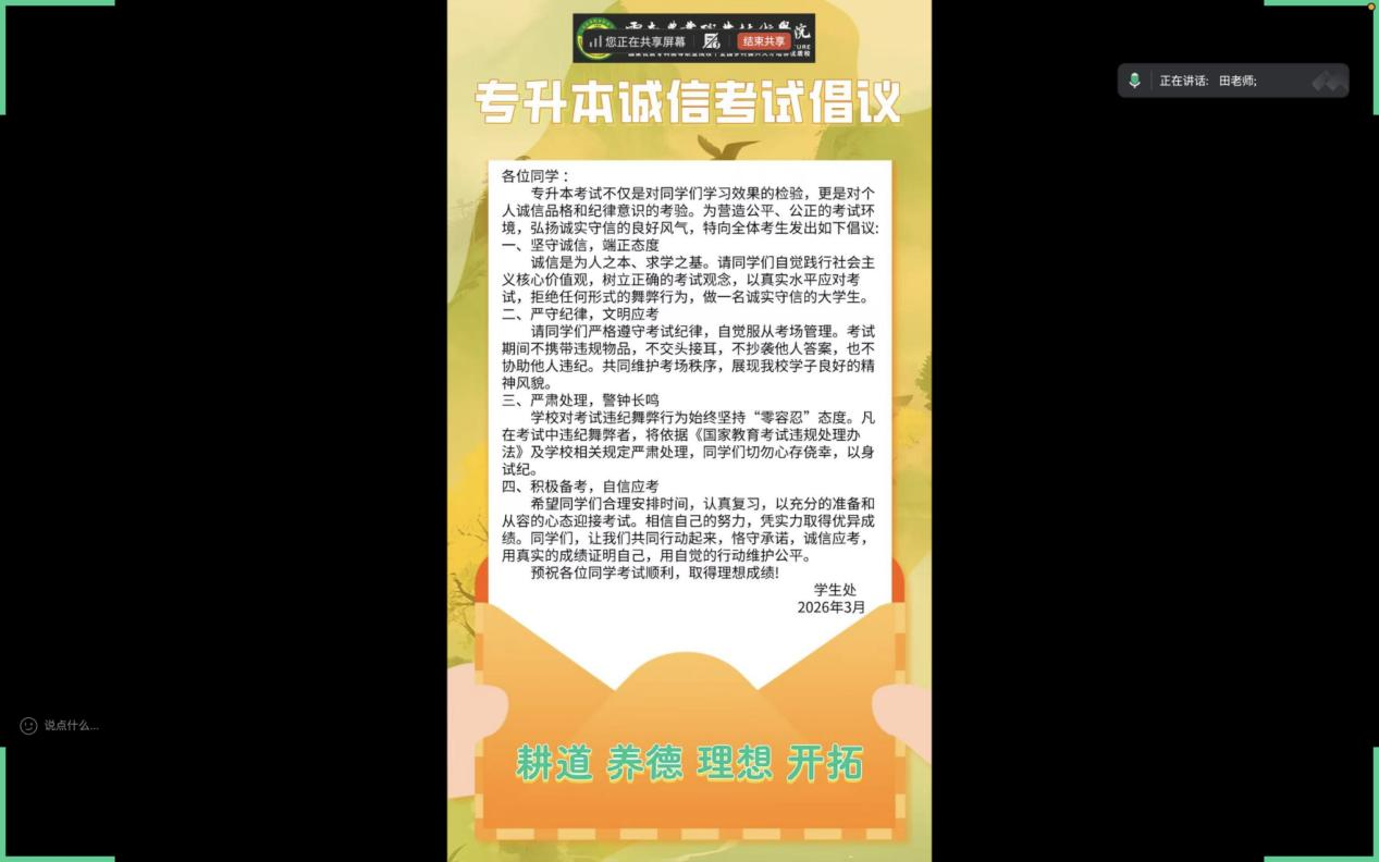 此次诚信教育线上班会,既是学院加强考风考纪建设的重要举措,也是对考生的考前关怀与引导。通过本次班会,有效增强了全体专升本考生的诚信意识和纪律观念,明确了考前准备要点,为专升本考试的平稳有序开展奠定了坚实基础。下一步,互联网技术学院将持续关注考生备考动态,做好考前各项服务保障工作,助力全体考生顺利完成考试。(文:田景韵 图:田景韵/审核:一审:陈娜、 二审:牛笛、 三审:胡琼/校对:一校:田景韵、二校:牛笛、三校:胡琼/责任编辑:田景韵)