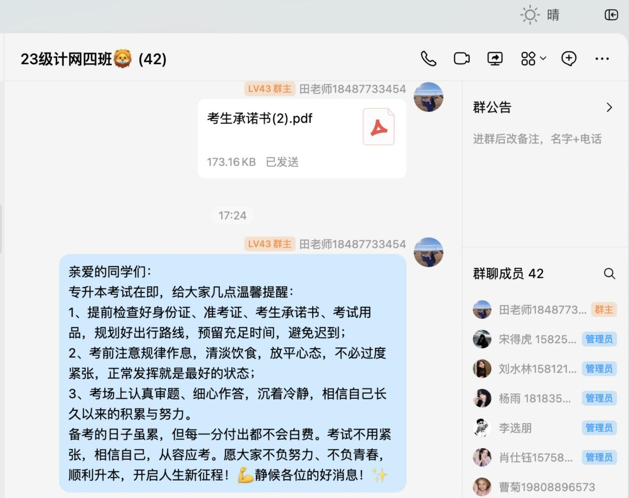 针对考前准备环节,班主任结合考生实际需求,给出了针对性建议,重点提醒考生提前熟悉考场规则、妥善保管准考证和身份证、考生承诺书,准备考试所需用品,同时引导考生合理安排作息时间,调整备考心态,以从容、自信的状态应对考试。